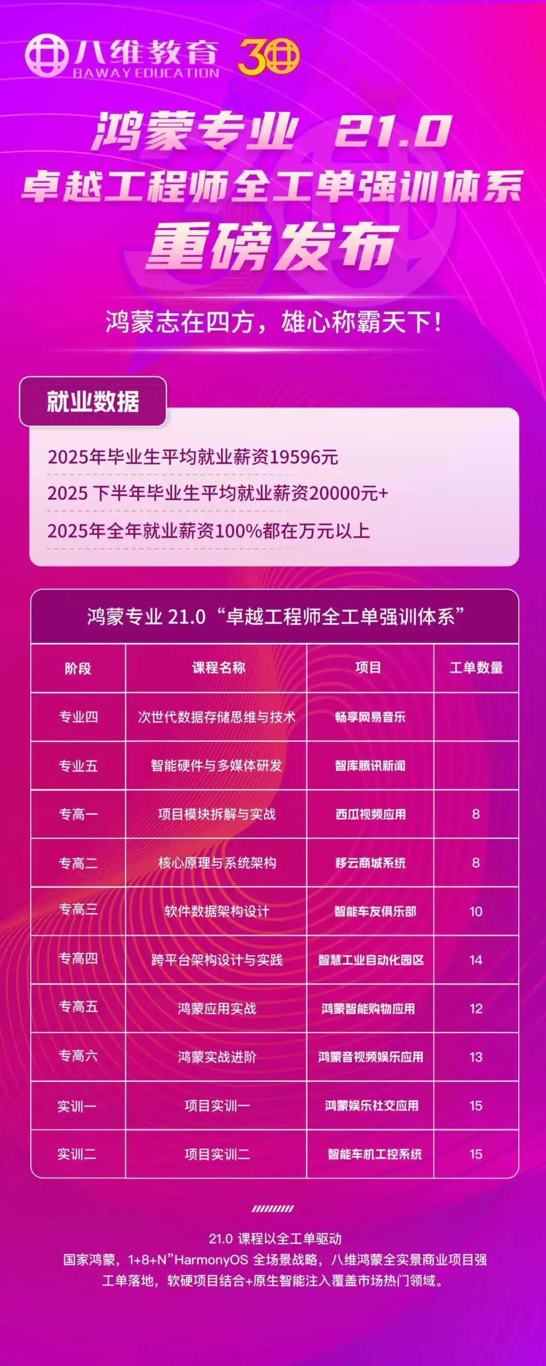 八维教育鸿蒙方向(游戏专业?鸿蒙方向)采用21.0 全工单强训体系,课程完全对标鸿蒙生态岗位能力要求,分阶段、重实战、强认证八维教育。