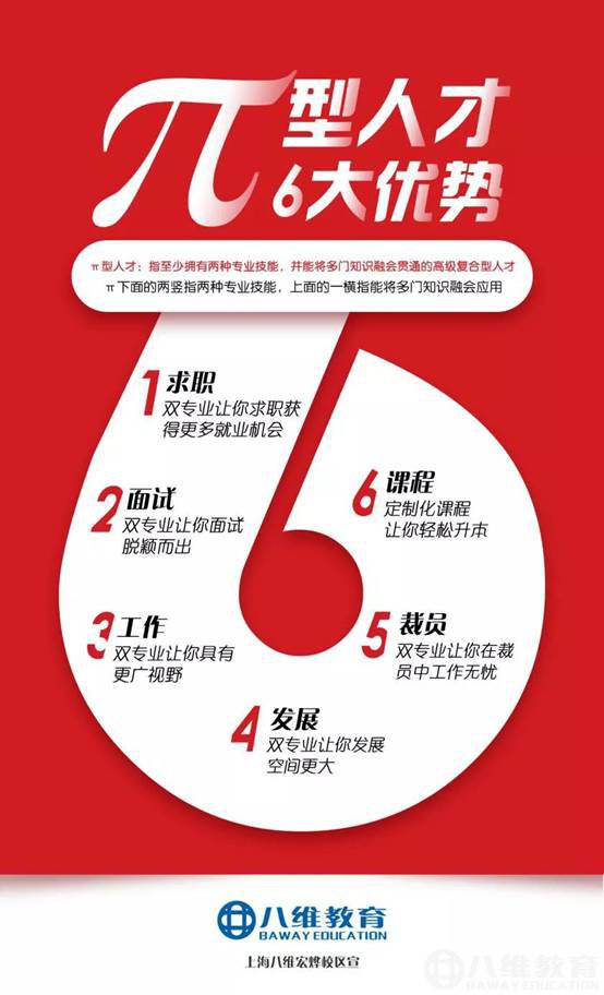 双专业使学生在求职过程中能获得更多的岗位。着科学技术的发展,传统教育培养的专业对口的专门性人才,已经满足不了社会发展的需要,企业更需要复合性人才。而八维培养的π型人才,如既懂IT技术又懂英语的学生,毕业后不仅能从事国内软件开发,还能当国际企业的工程师,还能做行业领域内的专业翻译,求职选择面比较大,所以求职中能获得更多的就业岗位。