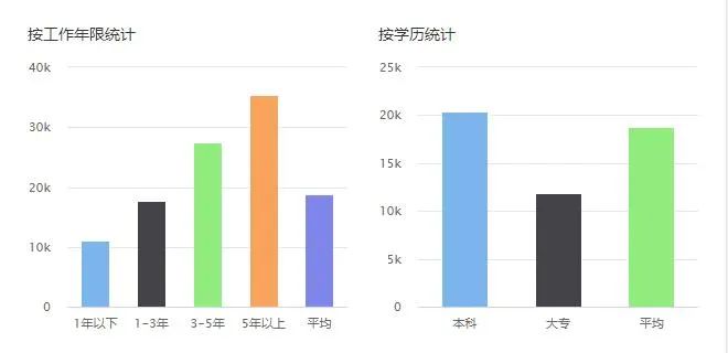 从学历和工作年限的维度来看,工作3~5年的月薪都在20K以上,工作5年以上的,月薪均在30K以上,而在学历要求方面,大专学历比比皆是。