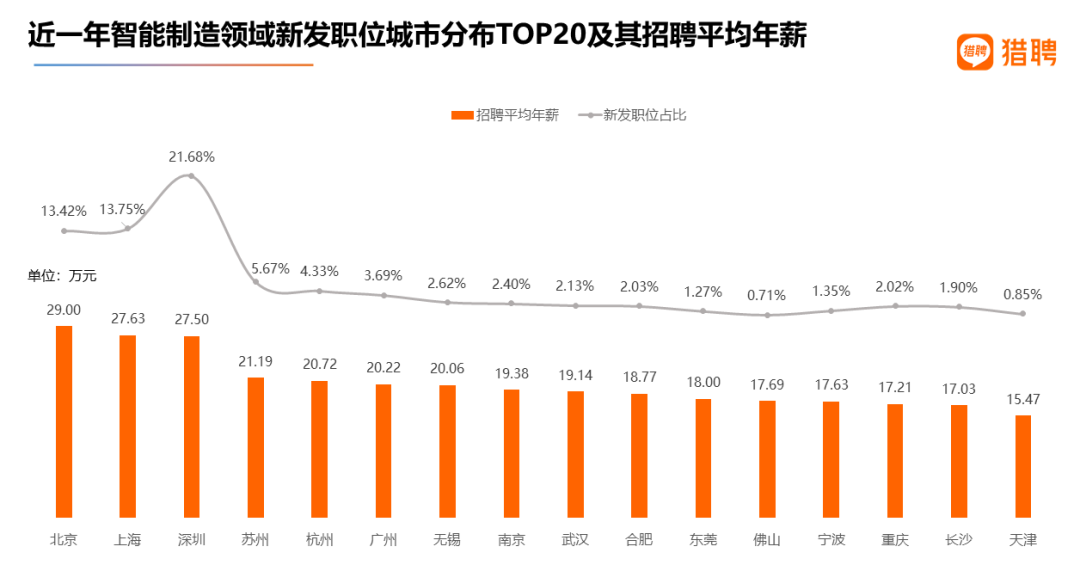 与此相对应的是,深圳、北京、上海也是智能制造中高端人才聚集最多的三个城市。另外,北京、上海及深圳的招聘平均年薪均名列前茅,分别为29万、27.63万和27.50万元。