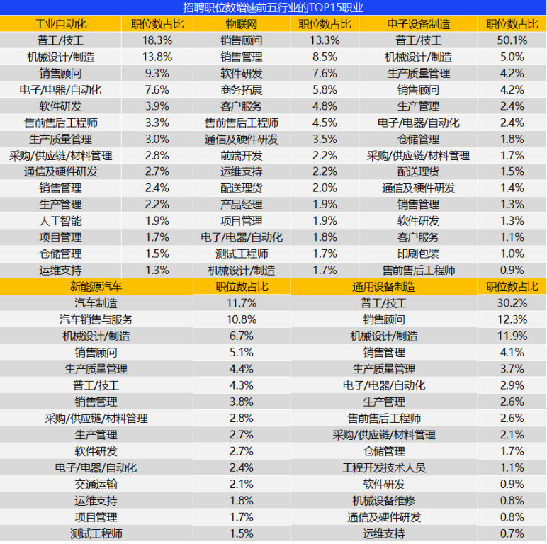 高技术制造业的不同行业中,职位需求占比存在较大差异。从表中可以看出,招聘职位数增速前五的行业中,“软件研发”岗位是大家普遍招聘的岗位,在部分行业中还包含了人工智能、前端开发、测试工程师、运维、通信等互联网相关岗位。