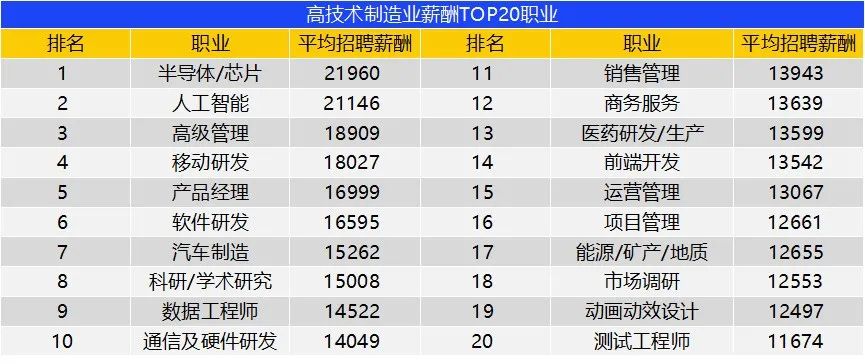 具体职业方面,半导体/芯片的平均招聘薪酬最高为21960元/月,其次是人工智能,达到21146元/月,平均薪酬均超过2万元。