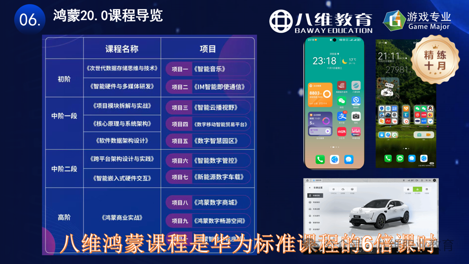 八维教育游戏专业主做领域为移动智能终端的应用软件,包括鸿蒙应用市场的软件研发,乃至于鸿蒙整个生态圈的硬件研发,包括嵌入式的研发,以及鸿蒙生态圈下的车机系统的研发。