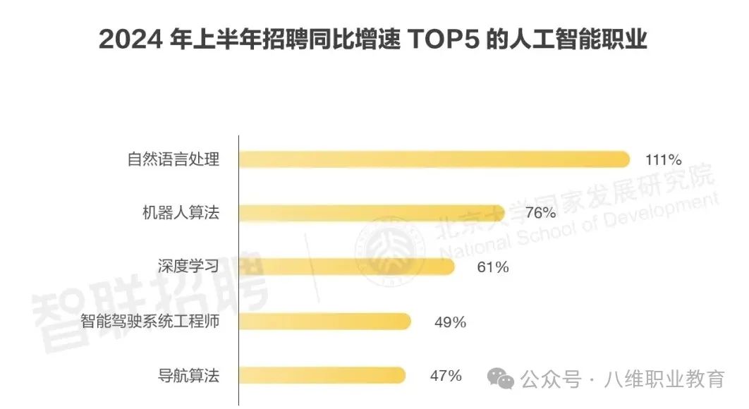 这些AI 技术的发展,带动了相关人才的招聘需求。智联招聘数据显示,2024年上半年,招聘职位数同比增速前五的人工智能职业中,自然语言处理岗位达到了111%,排在首位。今年一季度,自然语言处理工程师的招聘职位数同比增长126%,平均招聘月薪达到了24535元,同比增长12%。