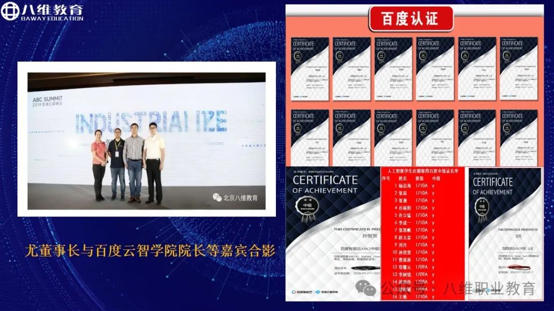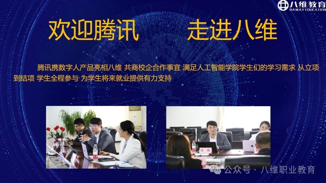 名企深度合作。八维与众多名企、大厂达成深度合作。如学生可考取百度认证等;腾讯携数字人产品亮相八维共商校企合作事宜,满足人工智能专业学生们的学习需求,从立项到结项,学生全程参与,为学生将来就业提供有力支持。