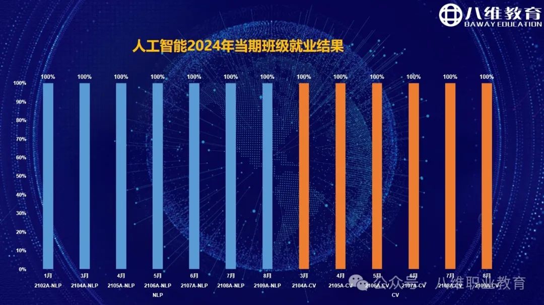自然语言NLP方向是八维人工智能专业主要开设两大方向之一。多年来,始终把学生就业放在首要目标,将就业目标贯穿教学始终,千方百计帮助学子高质量就业。