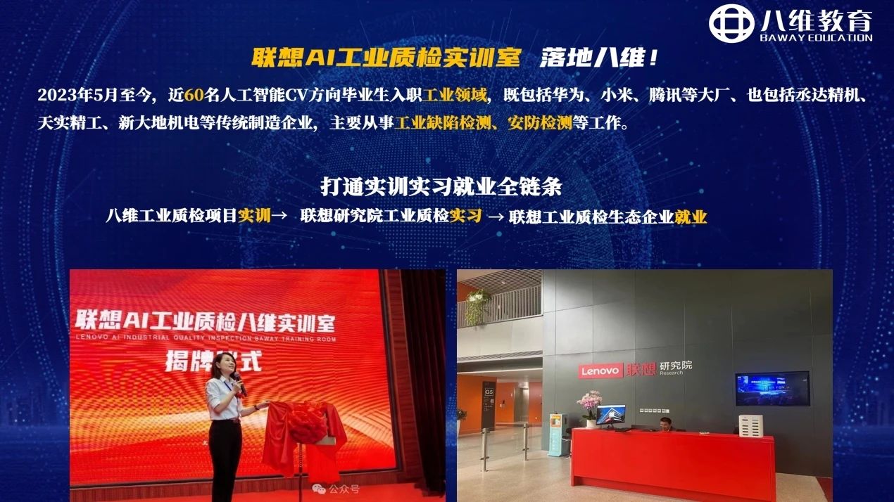 另外,八维文化与产业研究院通过引入联想AI工业质检实训室落地八维,打通了学生实训、实习、就业全链条,全方位帮助学子实现优质就业!2023年5月至今,近60名人工智能CV方向毕业生入职工业领域,既包括华为、小米、腾讯等头部大厂,也包括丞达精机、天实精工、新大地机电等传统制造企业,主要从事工业缺陷检测、安防检测等工作。