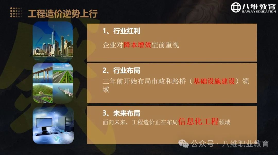 工程造价专业在建筑行业是与钱打交道的专业,主要是对工程项目的投资额、成本、利润空间进行预算。为什么在建筑行业整体增速放缓的背景下,工程造价领域却能逆势上行?八维建筑专业工程造价方向如何帮助学子们在建筑领域内实现华丽转身,高质量就业呢?
