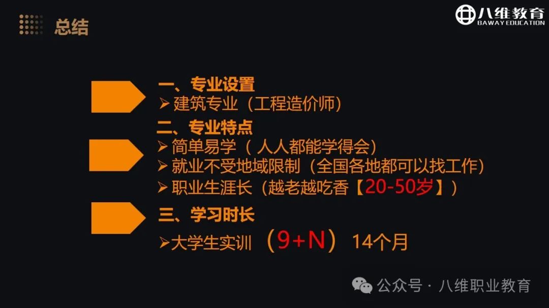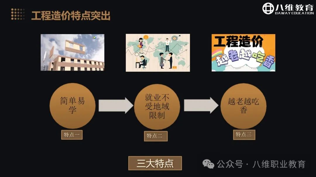 越老越吃香:建筑专业工程造价岗位不受年龄限制,随着从业经验的增加,职业的就业壁垒逐渐增加,核心竞争力自然变强。八维建筑专业以独特的教育教学模式结合八维创新教育理念,不断升级迭代工程造价专业课程,降低学习门槛;通过实训项目拔高学生专业技术壁垒,形成核心竞争力。
