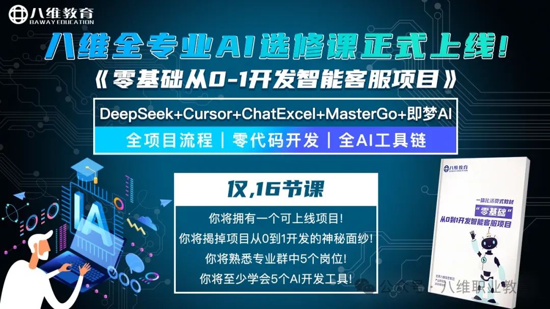 2025年精心打磨了《零基础从0-1开发智能客服项目》的AI课程,教你“无代码+全AI工具链”零起点掌握项目全流程。仅16节课,你将拥有一个可上线项目!仅16节课,你将揭掉项目从0到1开发的神秘面纱!仅16节课,你将熟悉专业群中5个岗位!仅16节课,你将至少学会5个AI开发工具!仅16节课,你将获得1本稀缺教材、1套项目示范视频、1套项目资源包。