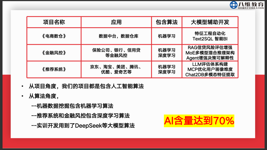 培养实战能力是八维教育的重中之重。在实战能力培养中,项目是核心基础。因此,在大数据专业中,学子能沉浸式学习并实操三大真实企业项目——《电商数仓》、《金融风控》、《推荐系统》,将实战技能提升一个台阶,实现技能“质”的飞跃。通过引入企业真实项目,让学生参与到其中,“项目驱动式”的学习能够助力学生在毕业前就积累下宝贵的实践经验。另外,依托于八维与众多知名企业达成战略合作,学生不仅能在课堂上接触真实项目,还能在课下走进名企,感受科技的力量。