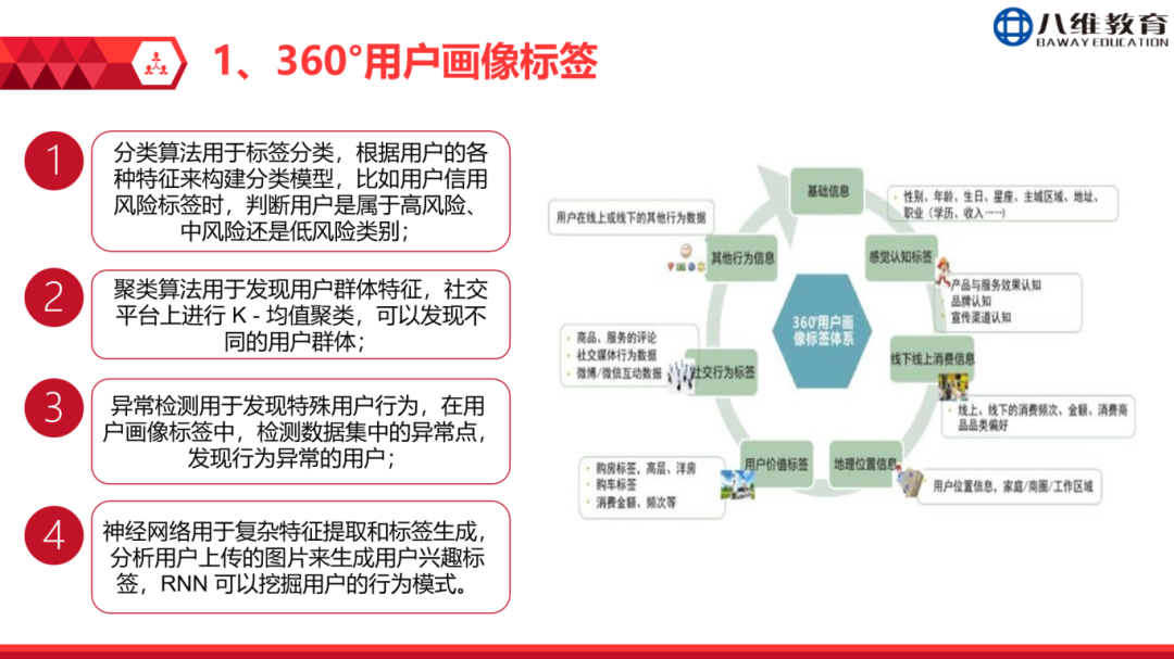 在原有标签体系构建、协同过滤、规则引擎与内容推荐等经典方法,以及逻辑回归、决策树等传统机器学习模型基础上,加入RNN、GRU等序列建模与深度学习算法,构建具备时序感知与深度表征能力的下一代智能推荐系统。通过开展360°全景用户画像项目,学生将进阶掌握基于自然语言处理(NLP)的语义标签自动提取、基于动态行为序列的实时聚类分析,以及融合深度特征的智能异常检测等前沿技能。实现对用户意图的深层洞察与动态预测,从而为跨场景、多模态的精准营销策略制定与深度用户价值挖掘,提供可解释、可迭代的智能化决策支持。