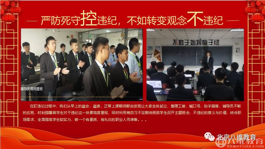人工智能专业通过实战项目的演练,强化技术能力来打造学生的“硬实力”,同时通过特色的学生自主管理体系,培养学生的管理能力和组织能力,培养学生“软实力”。通过晨会、日讲评、团建等等方式,让学生做一个有素质、有礼仪的职场人。