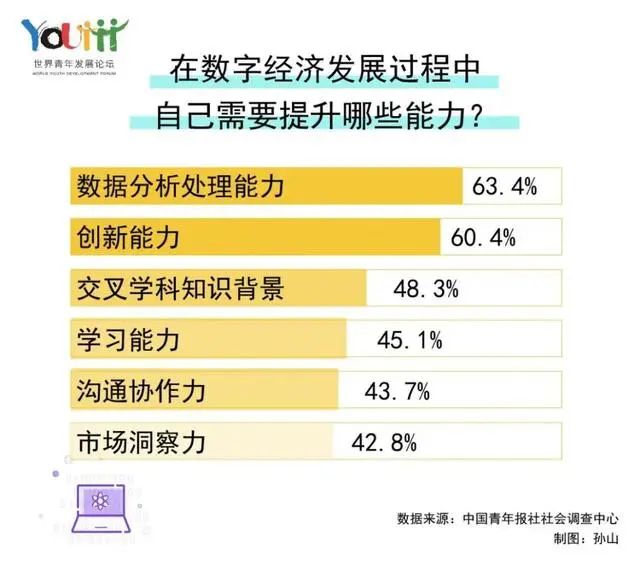 调查了解到,多数年轻人认为自身诸多方面能力尚有不足,仍急需提升。其中,数据分析处理能力(63.4%)、创新能力(60.4%)和交叉学科知识背景(48.3%)位于前三位。在此次“青年与数字经济”的调查中,受访者00后占33.3%,90后占45.4%,80后占21.3%。