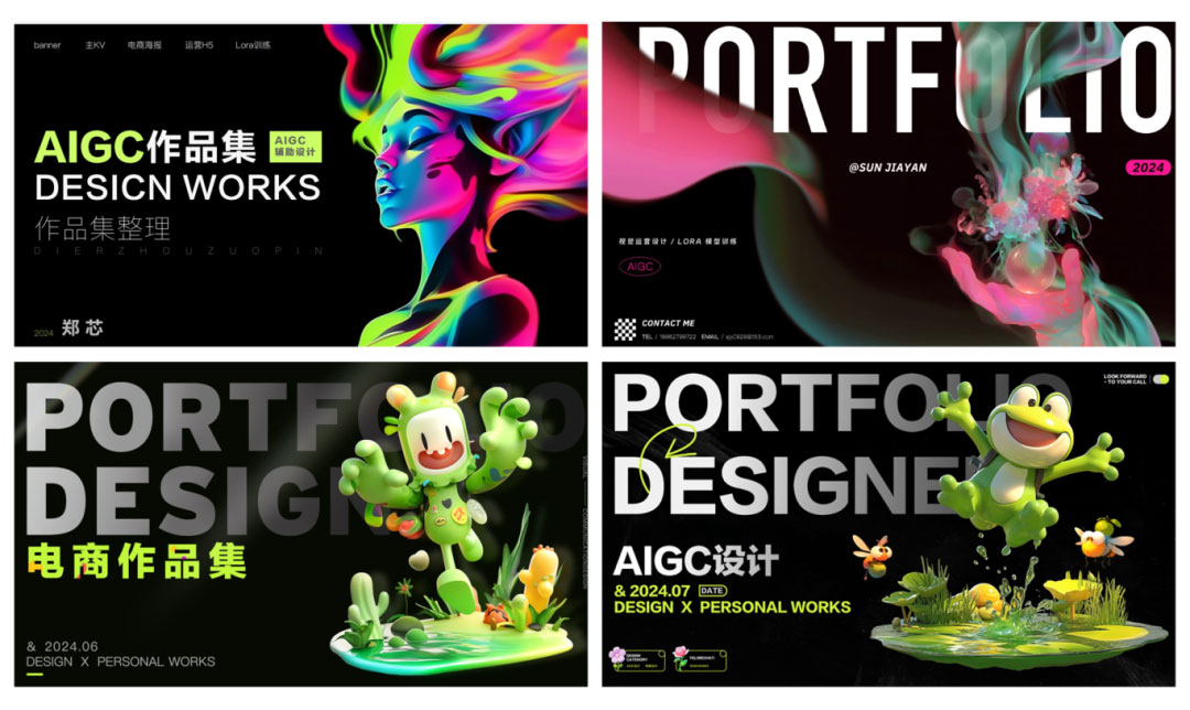 AIGC与动效精品集:AIGC生成创意视觉作品、AE制作的流畅动态特效、C4D打造立体视觉设计、多工具结合的综合创意案例。