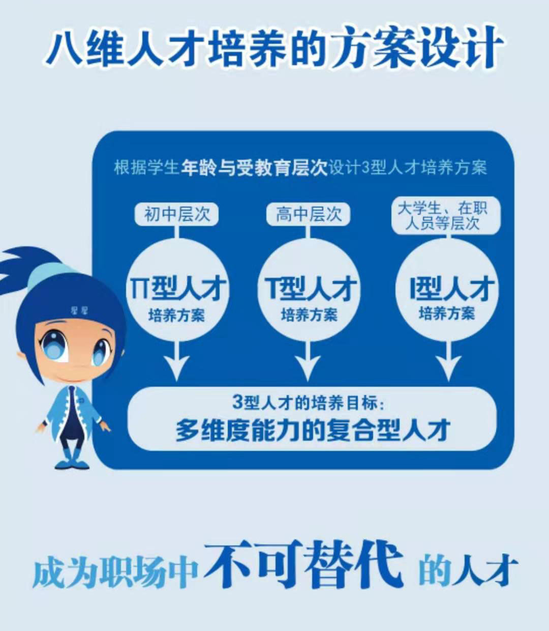 八维因材施教,针对不同阶段学生的学习特点,开发出“三型人才”培养体系:“I型人才”为大学生量身打造;“T型人才”充分满足高中生学习需求:“π型人才”的培养目标是使初中生成长为“两专多能的复合型人才”。三大产品各有特色与侧重,能更好的弥补不同层次学生的不足,同时发扬他们的长处,真正做到“补短扬长”。