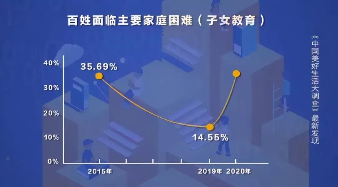 其中,“子女教育”问题在家庭面临最困难的问题中占比36.19%名列第三,达到了过去5年来的最高点。这显示了“子女教育”难题已经不仅仅是一个家庭的困难,而发展成为中国父母们普遍存在的集体焦虑。