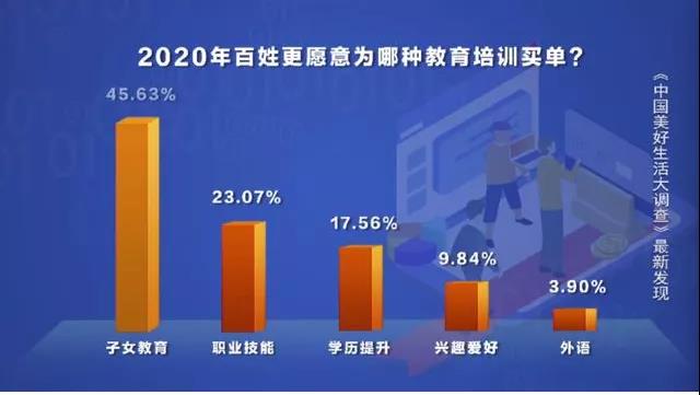 根据调查数据显示,在2021年有31.3%的群众表示想在教育培训上增加消费,那么他们更愿意为哪种教育培训买单呢?调查数据显示,排在第一位的就是“子女教育”,占比45.63%,而“职业技能类培训”排在第二位。如今家长为孩子“痛下血本”已经成为一种常态。