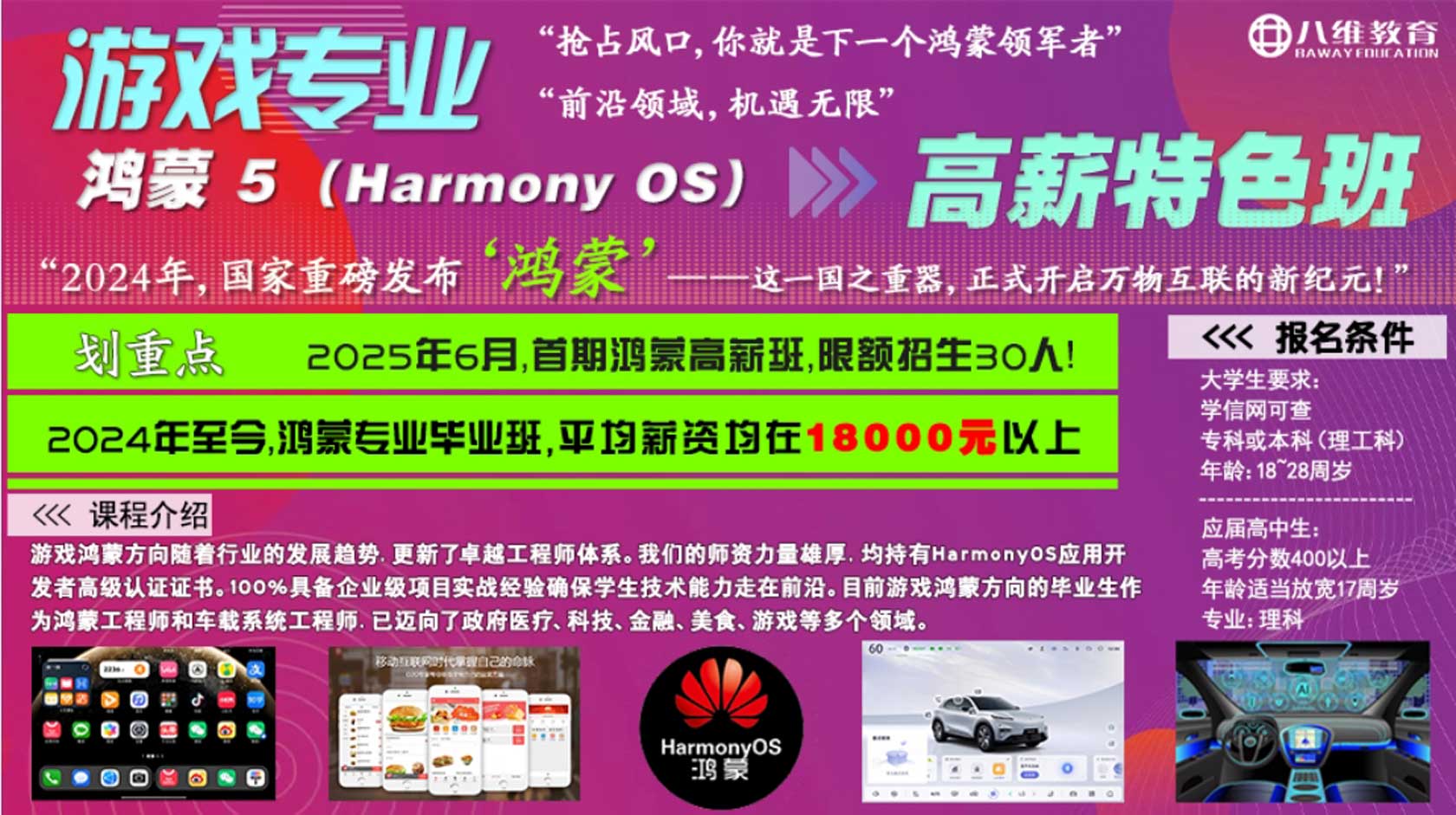 八维教育游戏专业主做领域为移动智能终端的应用软件,包括鸿蒙应用市场的软件研发,乃至于鸿蒙整个生态圈的硬件研发,包括嵌入式的研发,以及鸿蒙生态圈下的车机系统的研发。...
