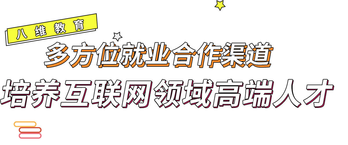 八维集团创立于1996年,是集产业、教育、研究及人力资源服务于一体的综合性企业集团。八维教育是八维信息集团旗下的教育品牌,自创建以来,一直致力于就 业教育,为了能够培养更多优秀人才输送给企业。集团围绕“优质就业”, 下设人力资源事业部,教育研究院、教育事业部、企业事业部等。依托集团 结构优势、地理位置优势、双师配置优势,成立以来向社会输送了数十万名人才,毕业学生遍布各大互联网公司。经过30年专注在就业教育领域的探索,逐步形成了具有八维教育特色、实践优势的“就业模式”、“实训模式"、“专业课数学模式” ,“文化职业素养培养模式”等。